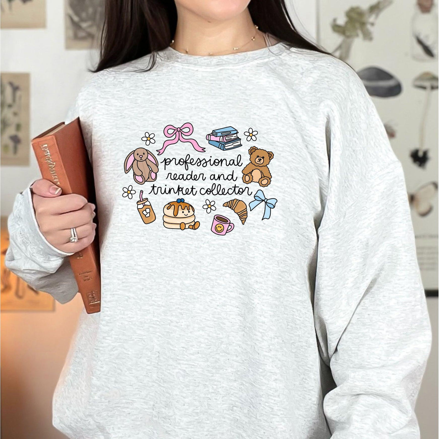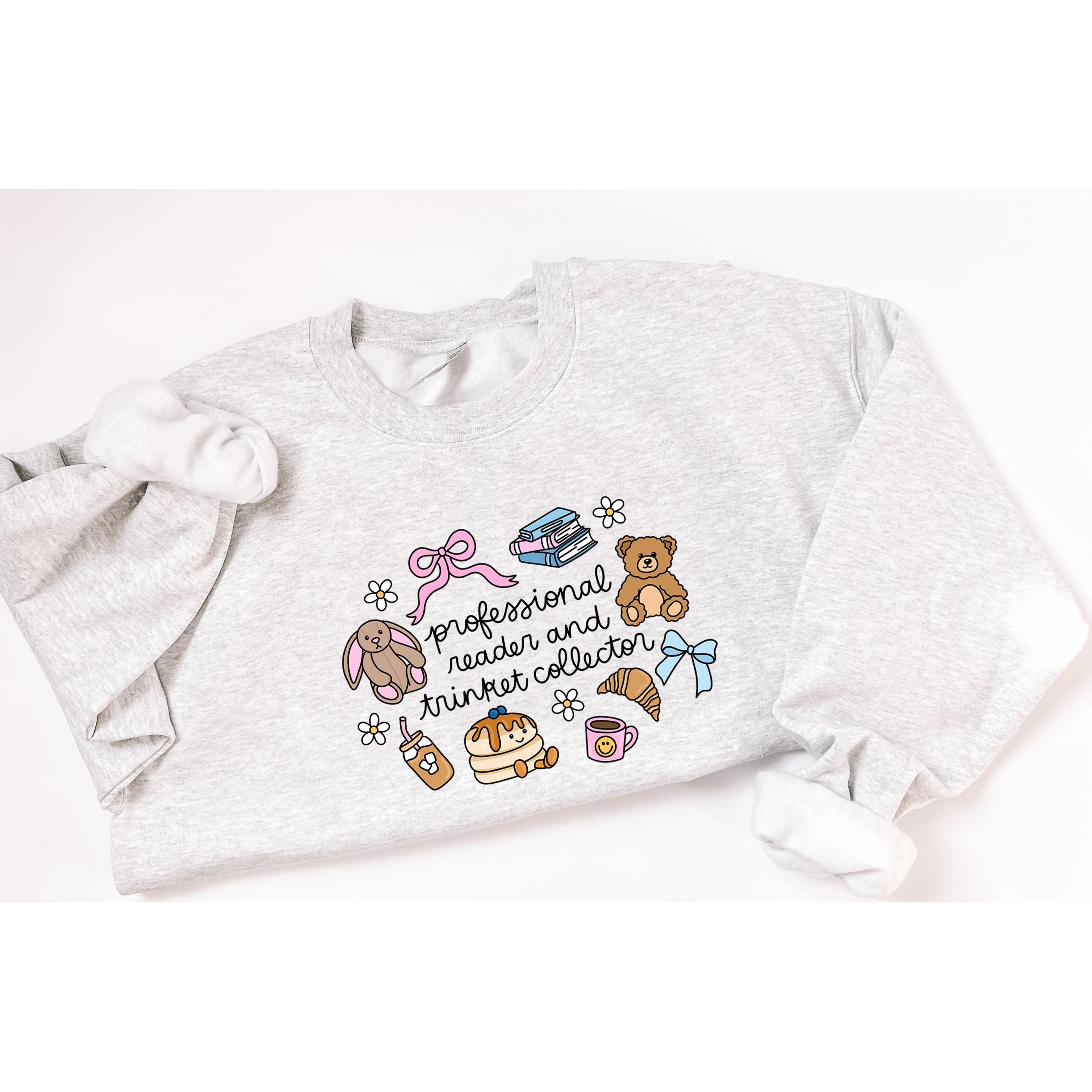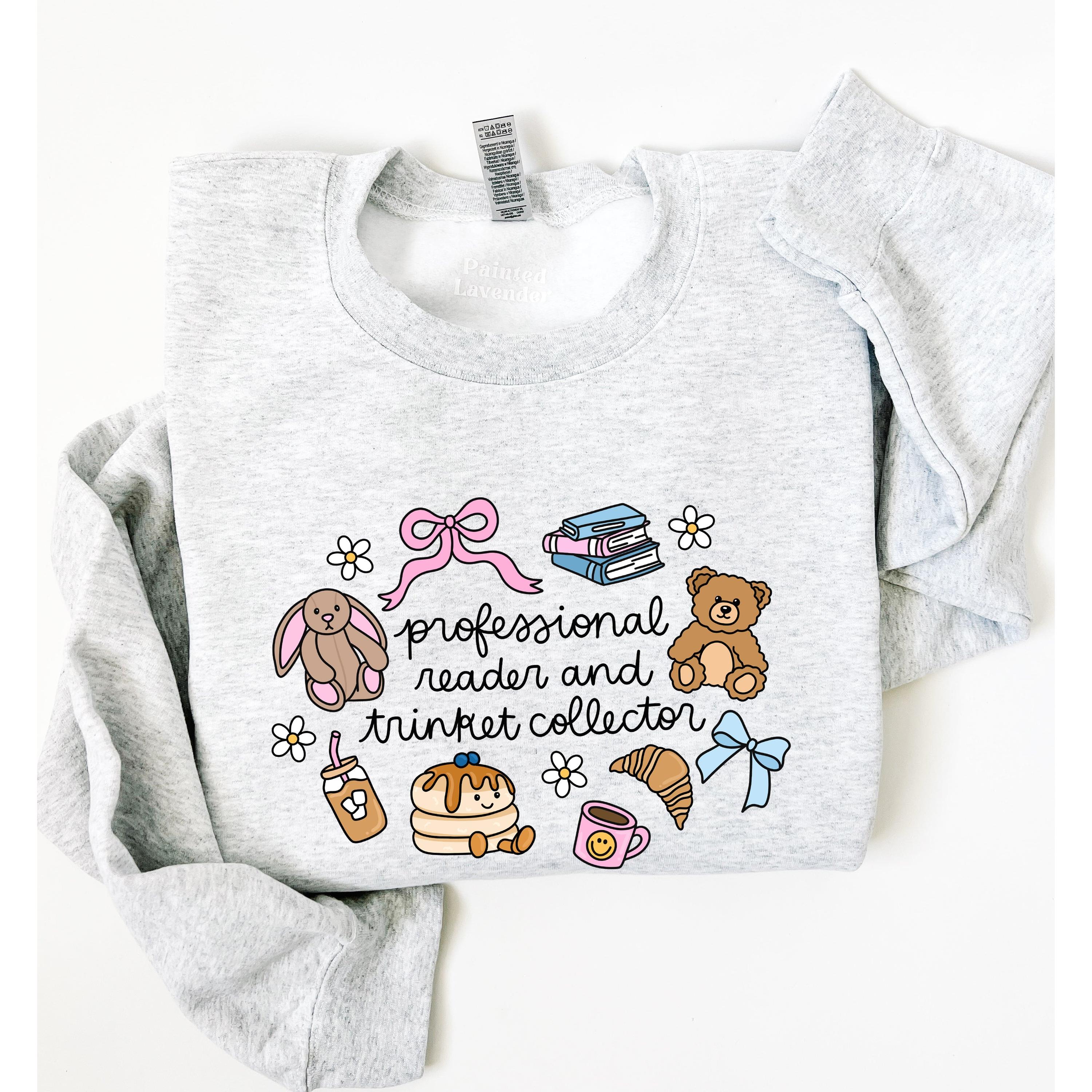 Add a dose of whimsy to your day with this professional reader and trinket collector crewneck! Perfect for the bookworm who finds joy in the little things, and loves little treats.