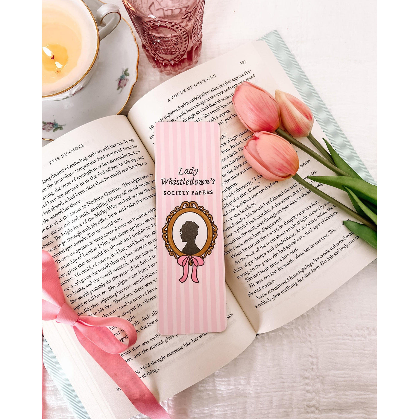 This Lady Whistledown bookmark is both regal and pretty, featuring a gilded gold vintage frame, the Whistledown cameo and finished with a pretty pink bow, against pink and white stripes. It's Regency romance coded!