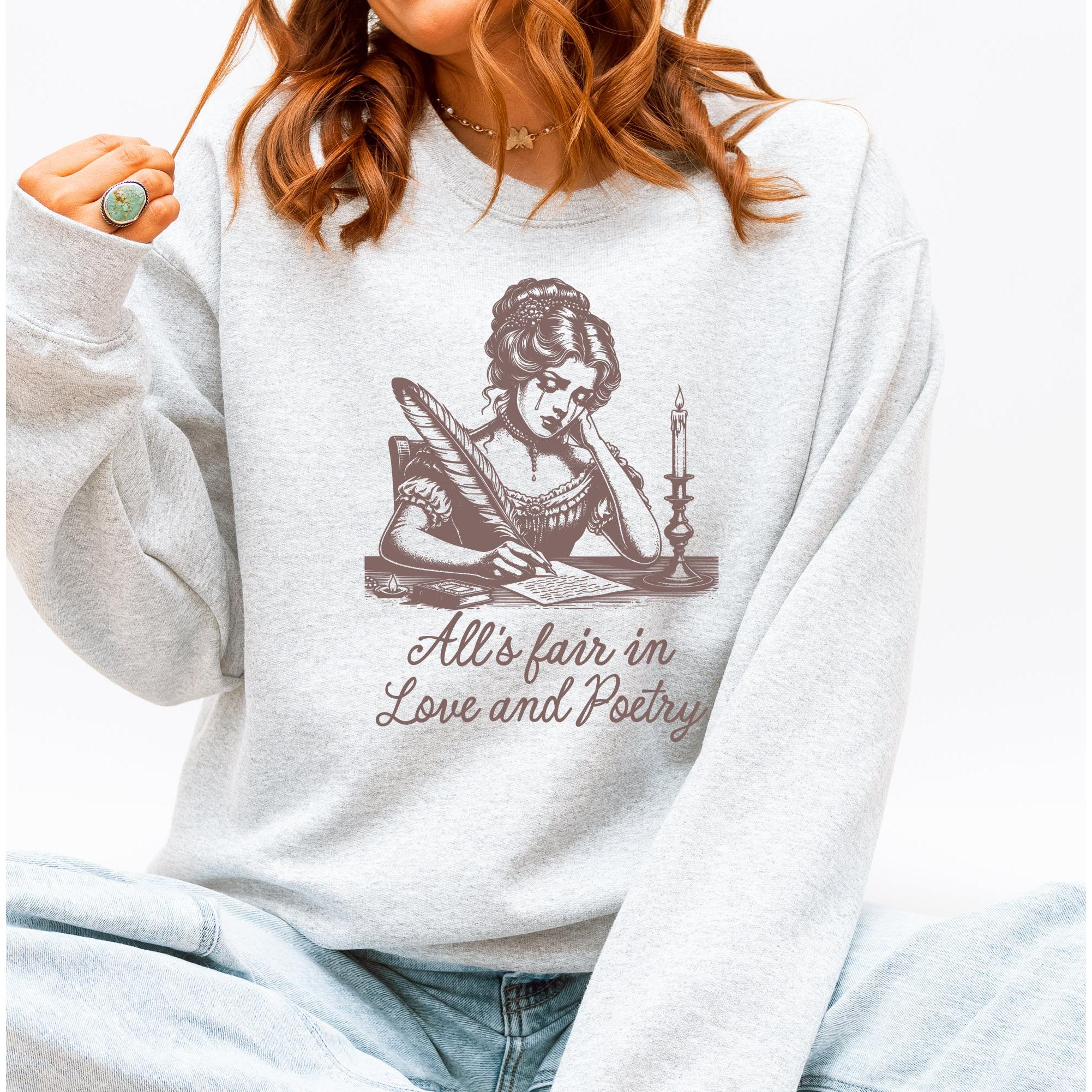 Vintage, regency style design in neutral color print, on comfy crewnecks, adding a little girly love to your day. Perfect for those that love period dramas, Taylor Swift, as well as poetry lovers and bookworms.