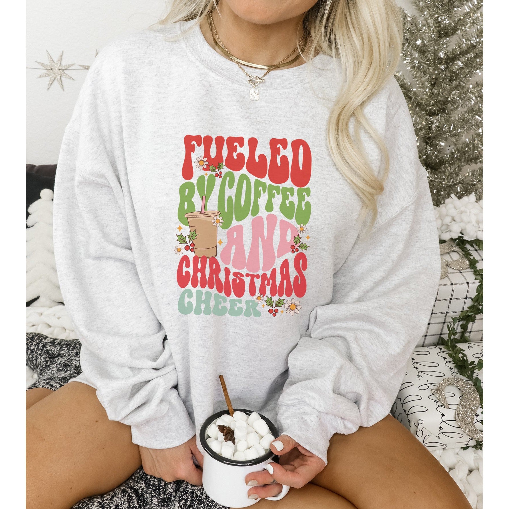 Coffee and Christmas cheer for the holidays! A fun and colorful design to uplift you and others. The perfect crew to wear while sipping your peppermint mochas and going to see Christmas lights!
